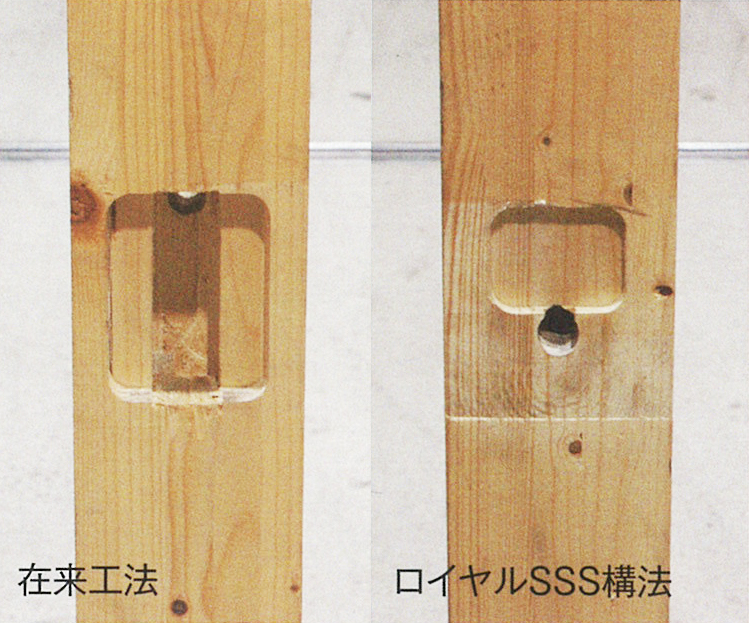 今までの在来工法では接合部分をたくさん削る必要があり、折れやすくなるという欠点がありました。「ロイヤルSSS構法」なら接合部分の削りを最小限に抑えられ、木の強さを最大限に発揮できます。