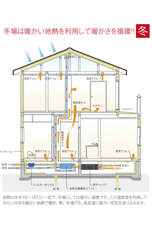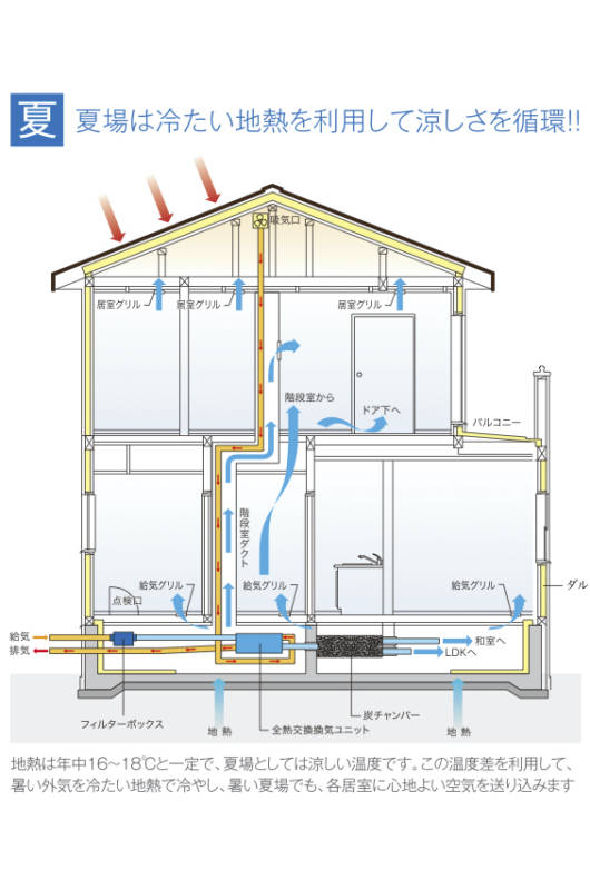 地熱は一年中16~18℃を保っています。その地熱を利用して、屋外から取り込んだ空気を暖めたり冷やしたりして、それぞれのお部屋に送ります。冬場なら給気口から取り込んだ冷たい外気を地熱で暖め、リビングやキッチンなどの各部屋に送り込みます。夏場は反対に、地熱で冷やした外気を家全体に送ります。