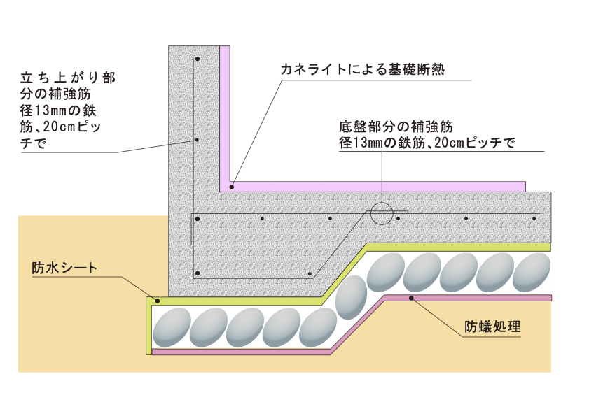 立ち上がっている壁部分と床一面を、鉄筋コンクリートで一体化した基礎です。大きな面で家の重みを支えるので、耐震性が高くなります。また、床下を厚いコンクリートで覆うため、地面から上がってくる湿気を防ぎ、シロアリも侵入しにくくなります。
