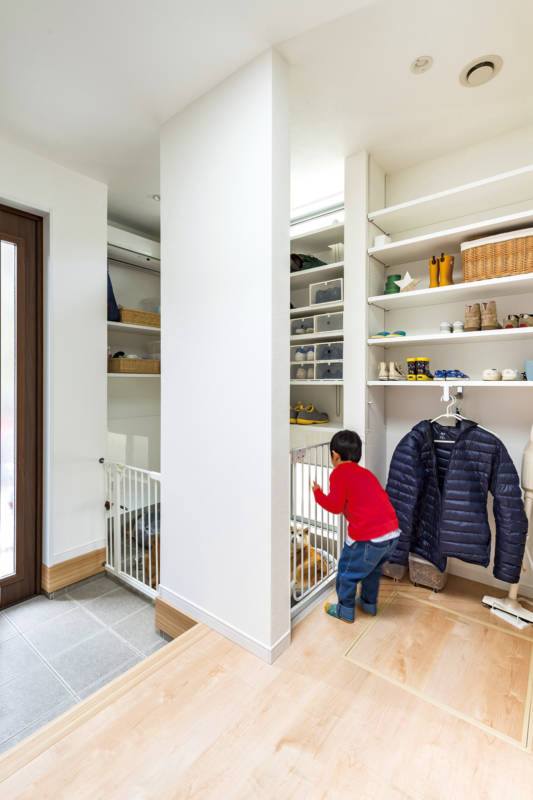 モノがあふれやすい玄関にはたっぷりとした収納棚を設置しました。家族4人の靴はもちろん愛犬のお散歩グッズもしっかり収納できます。