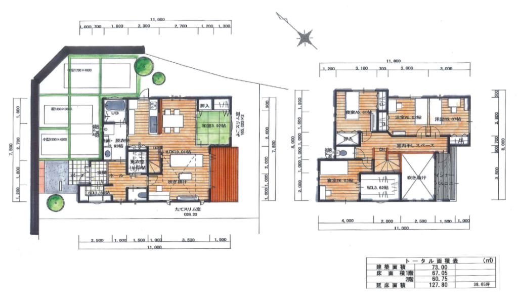 北38坪の吹き抜けモダン住宅の間取りプラン