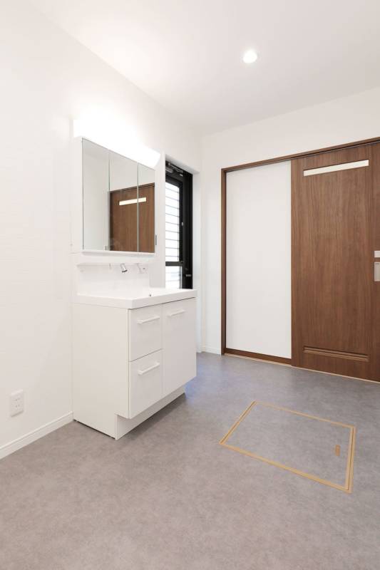 そこで、Yさま邸では、庭に設けた物干し場にストレスなく行けるよう、広い洗面脱衣室に出入り口を配置。洗濯機から物干し場への動線が、非常に短くなっています。