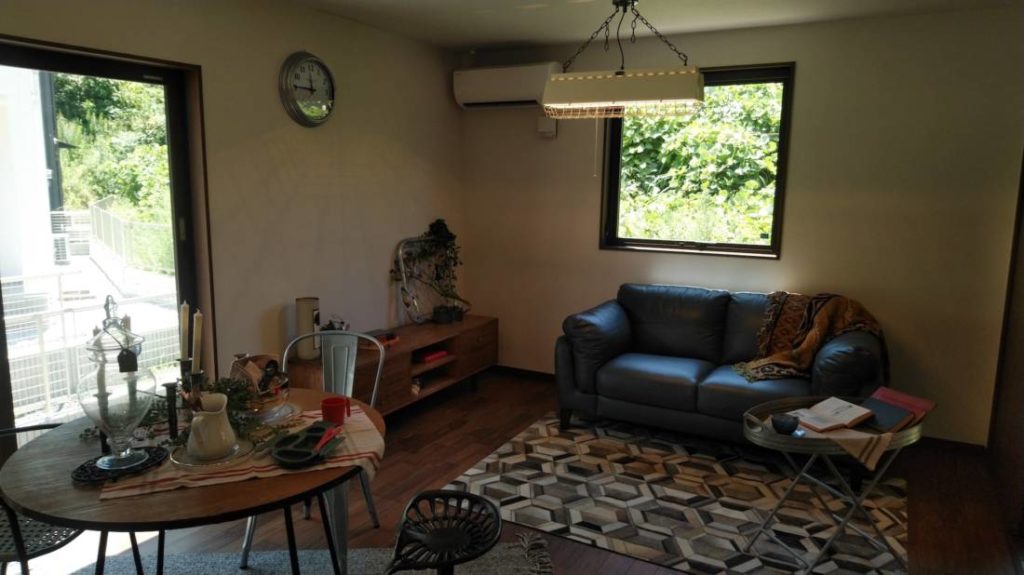 こちらのリビングは、ウォルナットの色を基調に落ち着いた雰囲気のお部屋です。そこに、ヴィンテージ感たっぷりのテーブルや照明、ラグなどでオシャレな空間をつくりました。