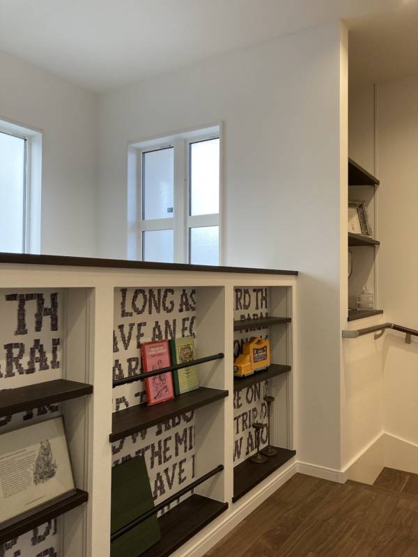 階段踊り場と吹き抜けの腰壁には、アクセントクロスと木目色の棚板でオシャレな飾り棚を設けました。
