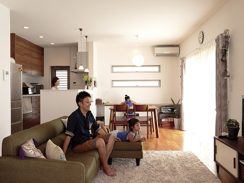 システムキッチンの片側が壁についたペニンシュラタイプを採用し、一体感があるLDKを実現。リビングでくつろぐパパやお子さまにも声をかけやすいつくりになっています。