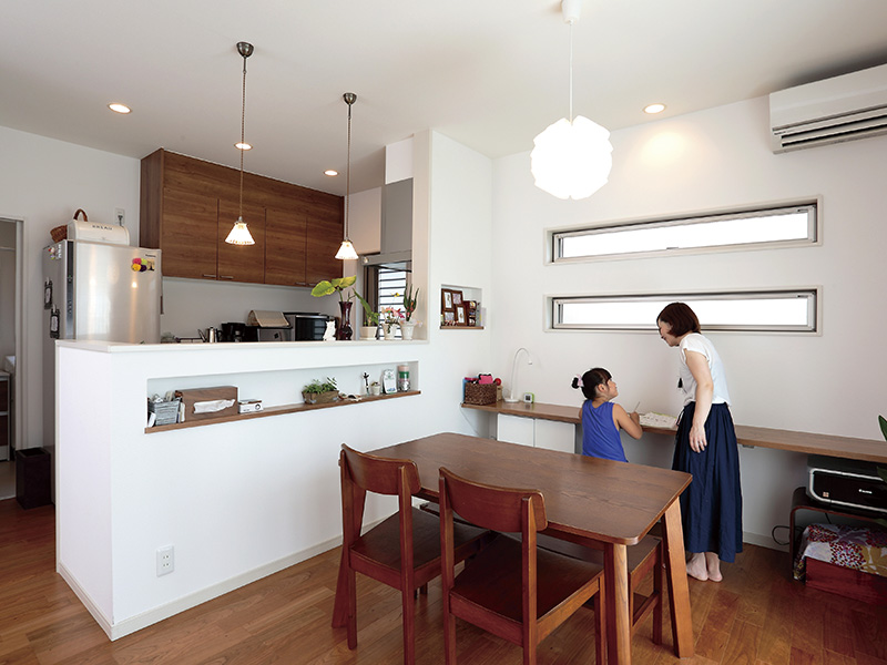 ダイニングには、天板の下が収納スペースに利用できるカウンターを設置。