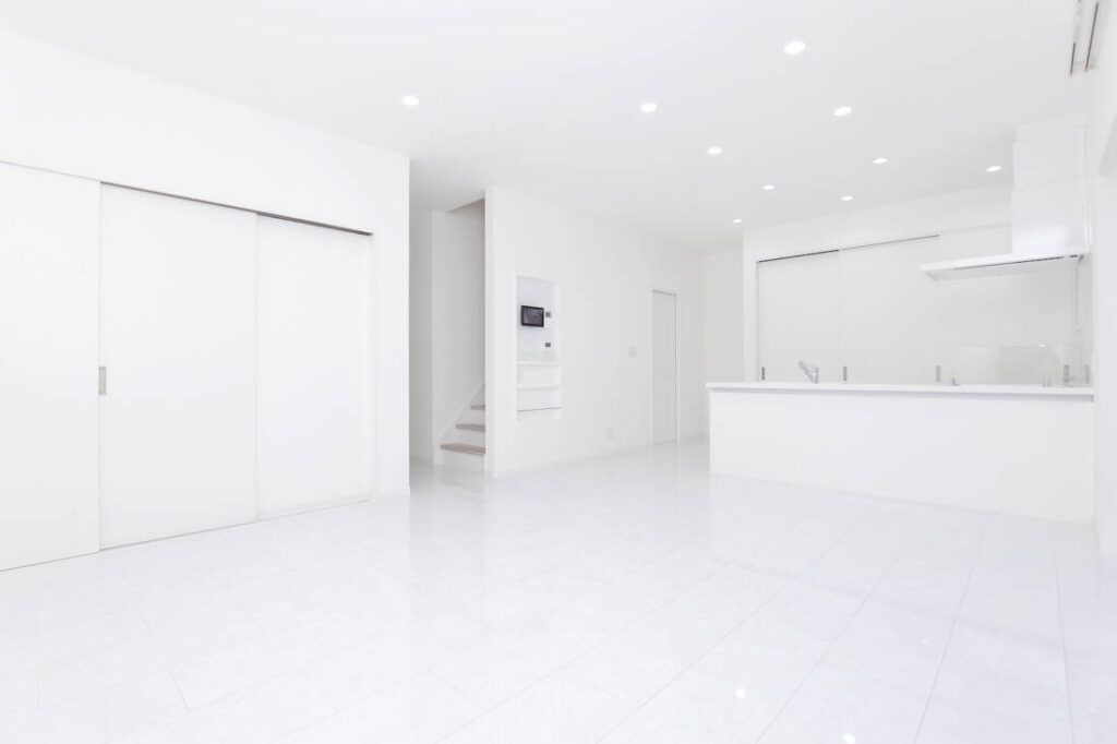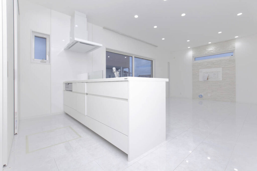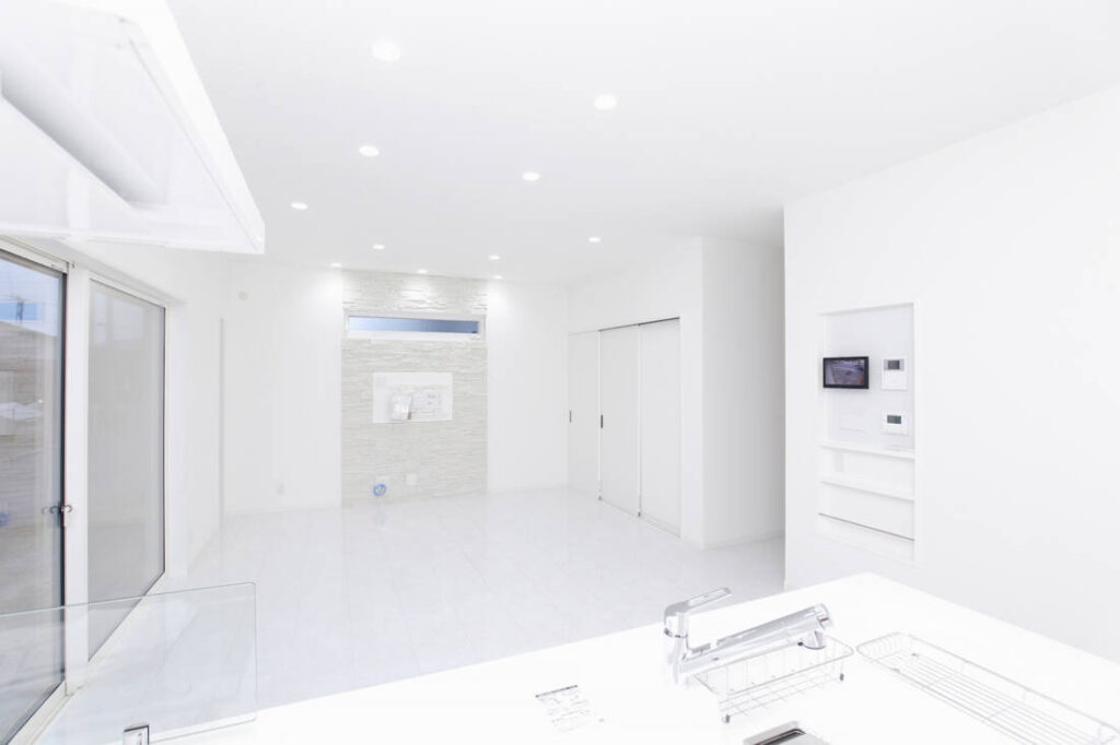 そこで、LDKは、壁、天井、床、システムキッチンまですべて白に統一し、広々とした清潔感のある空間に。TV背面の石貼りはアイボリーホワイトにして、統一感の中に上品なアクセントをつけています。