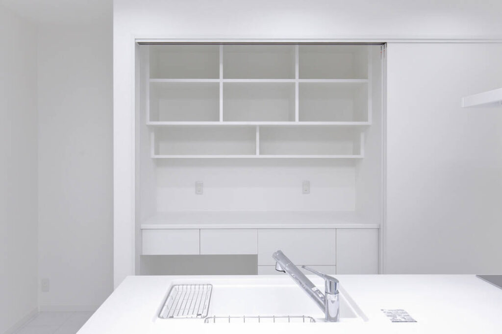 そこで食器や調理家電、ストック品などをたっぷり収納できる背面収納に扉を設け、極力生活感の出ない工夫をしました。これで来客時もスッキリした印象でお迎えできます。