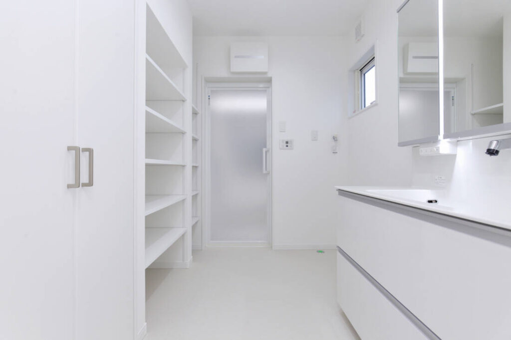 洗面化粧台はW1200サイズを採用したため、洗面などの動作がゆったりできる上、収納もたっぷり。洗面脱衣室の壁面いっぱいにも収納スペースを設けたため、タオル類はもちろん、下着やパジャマなども収納可能。入浴のたびに居室まで取りに行く時間も手間も省けます!