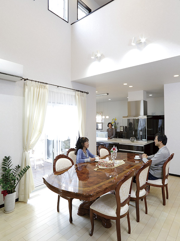 リビングの上は広い吹き抜けにし、8人という大家族ながらも開放感バツグンでのびのび過ごせる空間に。吹き抜けにすることで、2階に居ても1階に居る人の様子を感じられるなど、ご家族皆さまが安心して暮らせる間取りになっています。