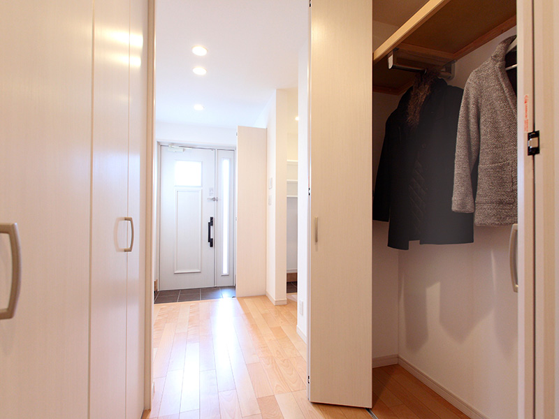 そして、玄関ホールにはファミリークローゼットを設置。コートやバッグなどを置けるのでお出かけがスムーズ。帰宅後はすぐに仕舞えてリビングなどが散らかりません。