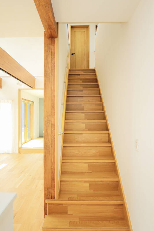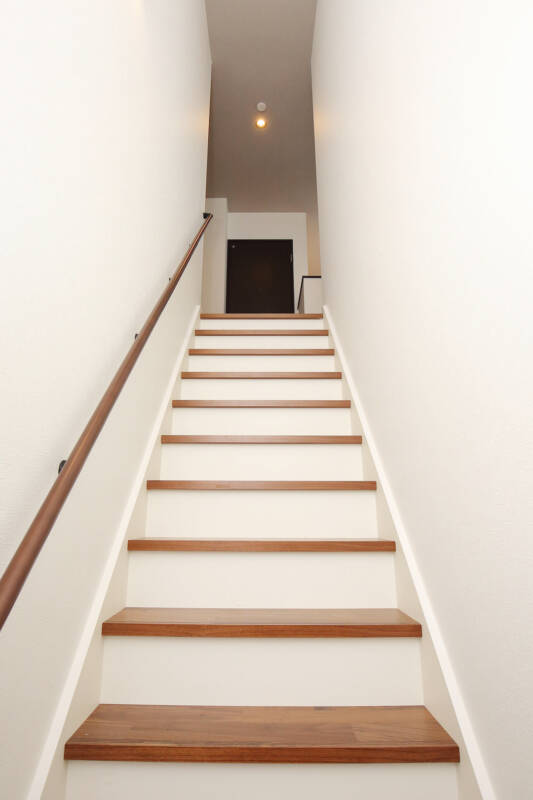 大きく異なるのは、蹴込板(けこみいた)と呼ばれる踏板と踏板の間に垂直に立てた板の部分です。一つは白のクロス、もう一つは床と同じ木で仕上げています。