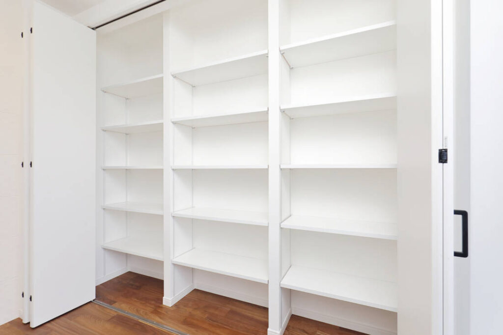 ウォークイン型やウォークスルー型は広いスペースが必要になりますが、壁一面を収納にし大きな折れ戸を付けることで、省スペース&大容量の収納を実現しています。