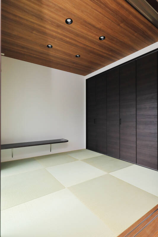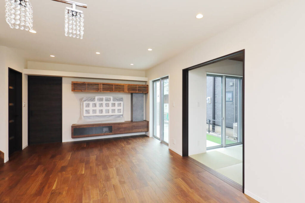 リビング和室の天井はキッチンの天井と同じクロスを採用し、LDKとのつながりを演出。カウンターを付け、作業をしたり小型のテレビ等も置けるようにしています。