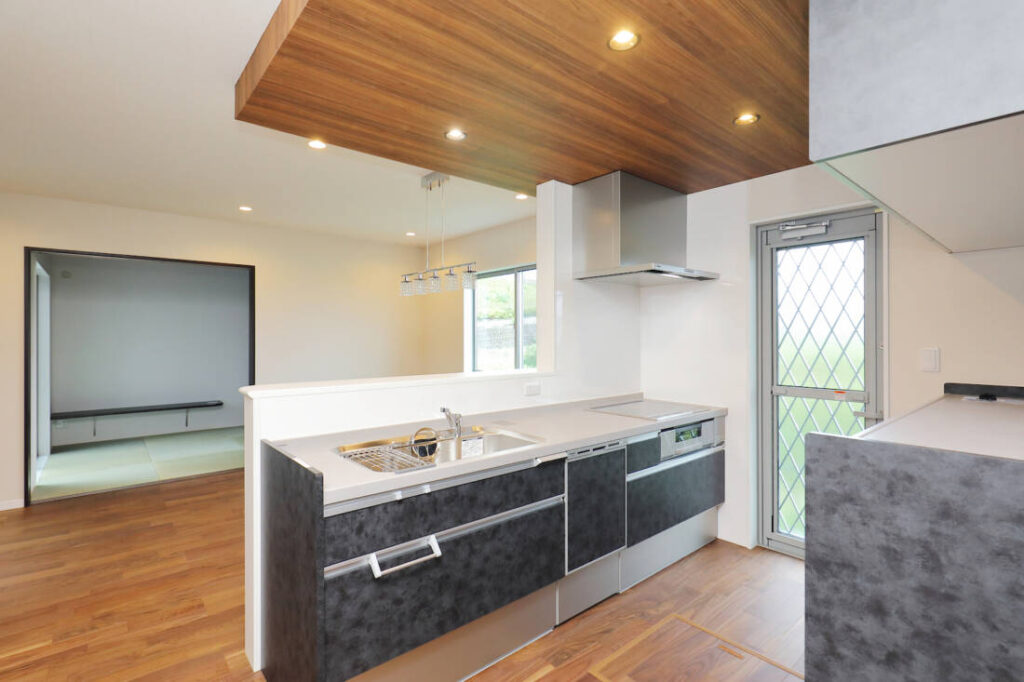 ペニンシュラタイプのキッチンは、天井の一部を下がり天井にして木目のクロスを採用。