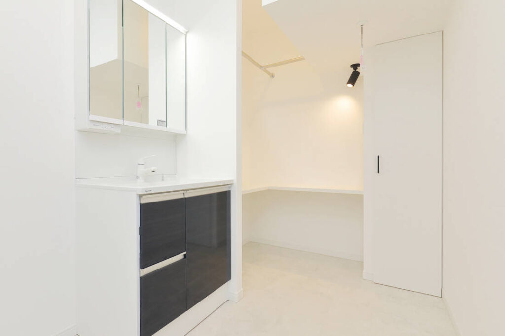 白を基調にした清潔感のある洗面脱衣室の奥には、ワークカウンターと収納棚を設置。