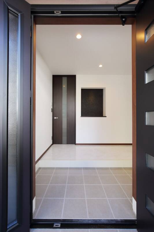 Yさま邸の玄関も親子ドアを採用しました。開口が広がるため、冷蔵庫や洗濯機など大型家電を買い替えた際の搬入もラクラク。車いすの出入りもスムーズですし、土間の掃除もしやすくなります。見栄えが豪華な雰囲気になるのも良いですね◎