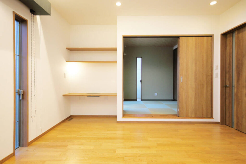 両側が壁なので、勉強はもちろん、リモートワークにも集中できるスペース。造作棚を設け、本や書類等もスッキリ収納できるようにしました。