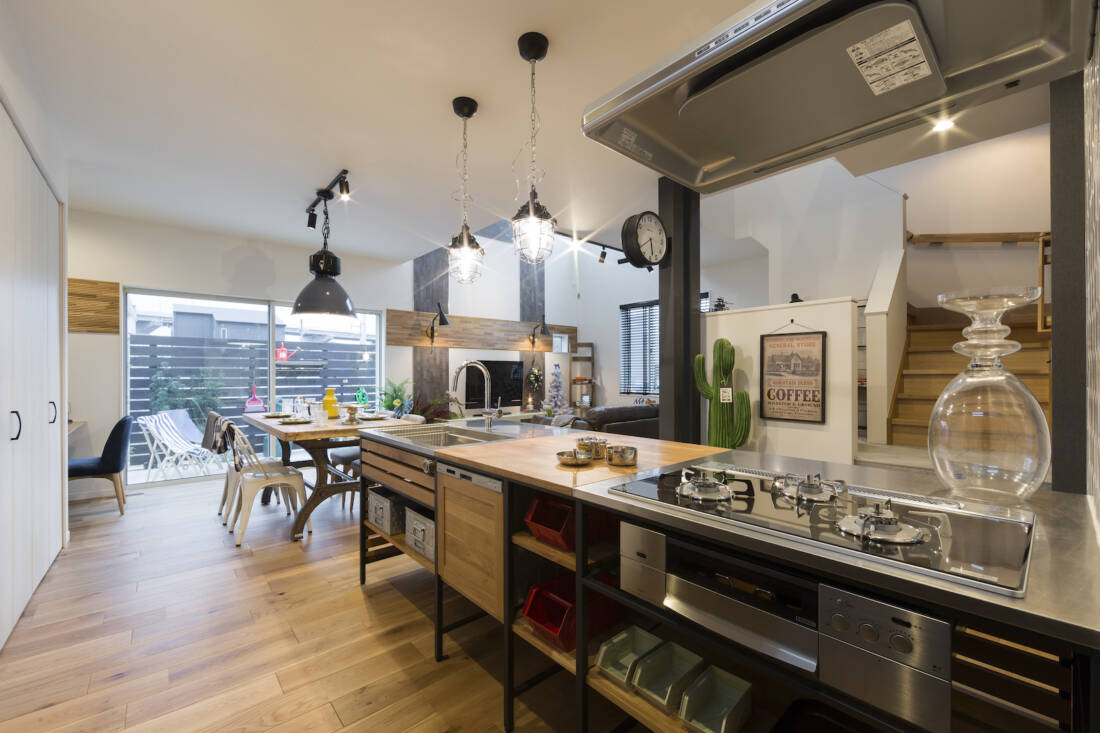 お料理をしながら、ダイニングやリビング、スキップフロア、お庭のタイルデッキなどで過ごすご家族の様子を確認しやすいようキッチンの配置にもこだわっています。