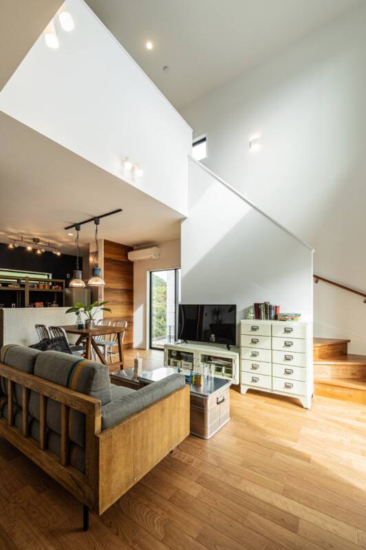 リビング階段と吹き抜けを組み合わせることで、開放感も明るさもグンとアップ。