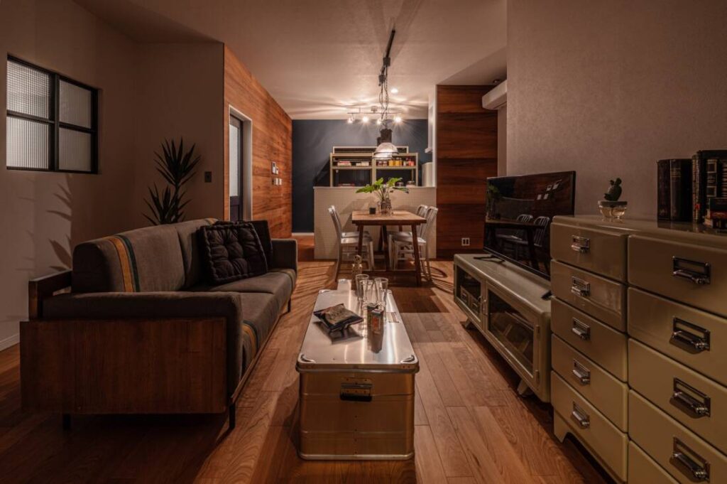 こちらは、ガラリと雰囲気の違う日暮れ後のLDKです。