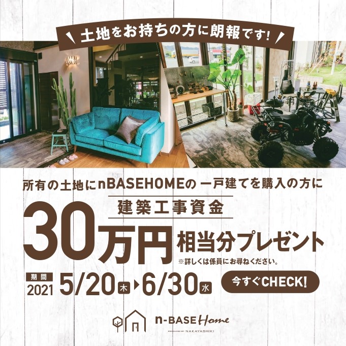 土地をお持ちのお客様で、6月末までになかやしきでご成約頂いたお客様限定に建築工事資金として総額30万円をプレゼント致します!!!