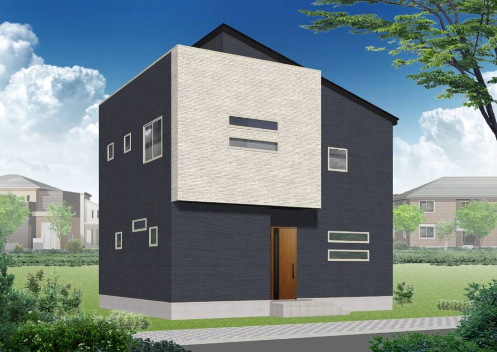 外観は、モノトーンの外壁にアクセントで木目の玄関ドアを付けているのが特徴です。