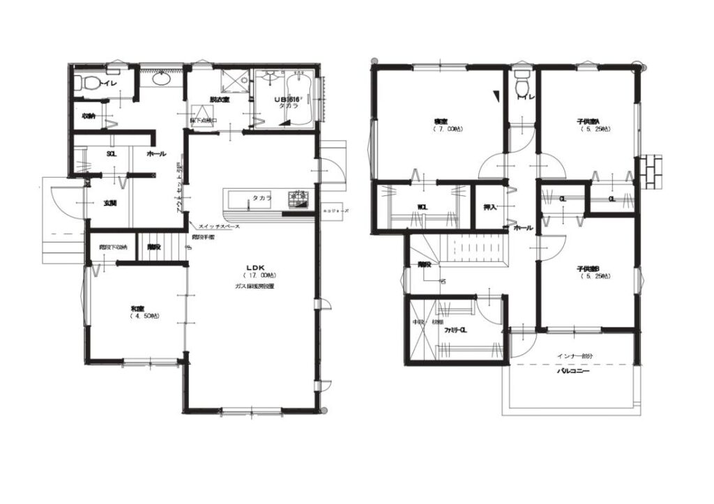 1階部分に和室とLDKと水廻り、二階に子供室2部屋と寝室の4LDKの間取りとなっております。