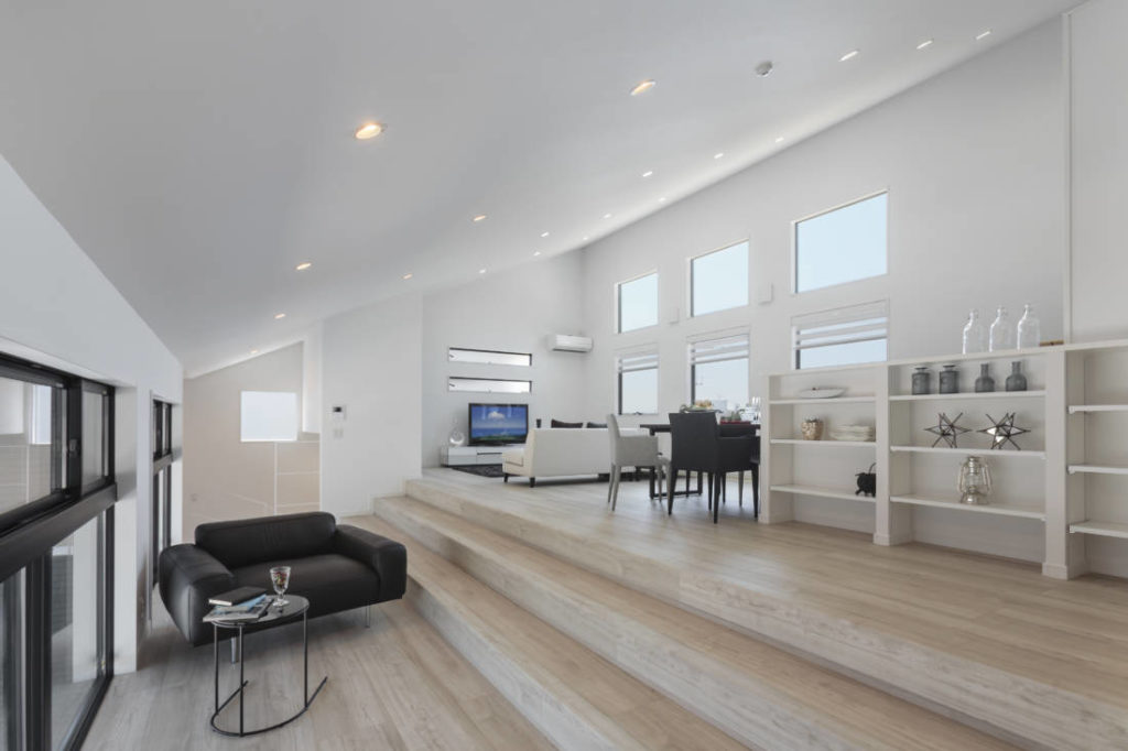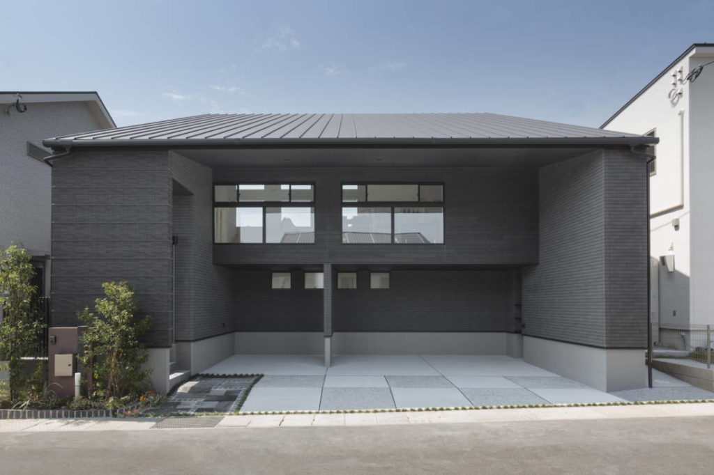 大きく張り出した軒下は、一階の約半分を占めるダイナミックな吹抜け半戸外空間。無柱の木造大空間テクノロジーをベースに、「ソトあそびを、ウチで楽しめる」新発想の住まいが誕生しました。